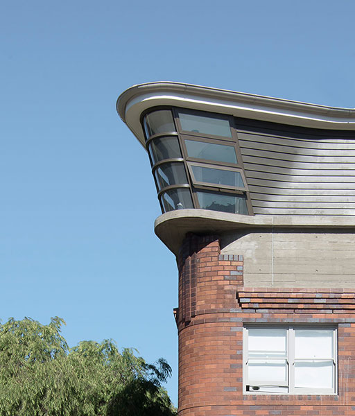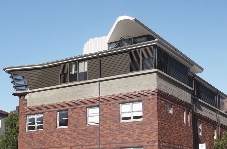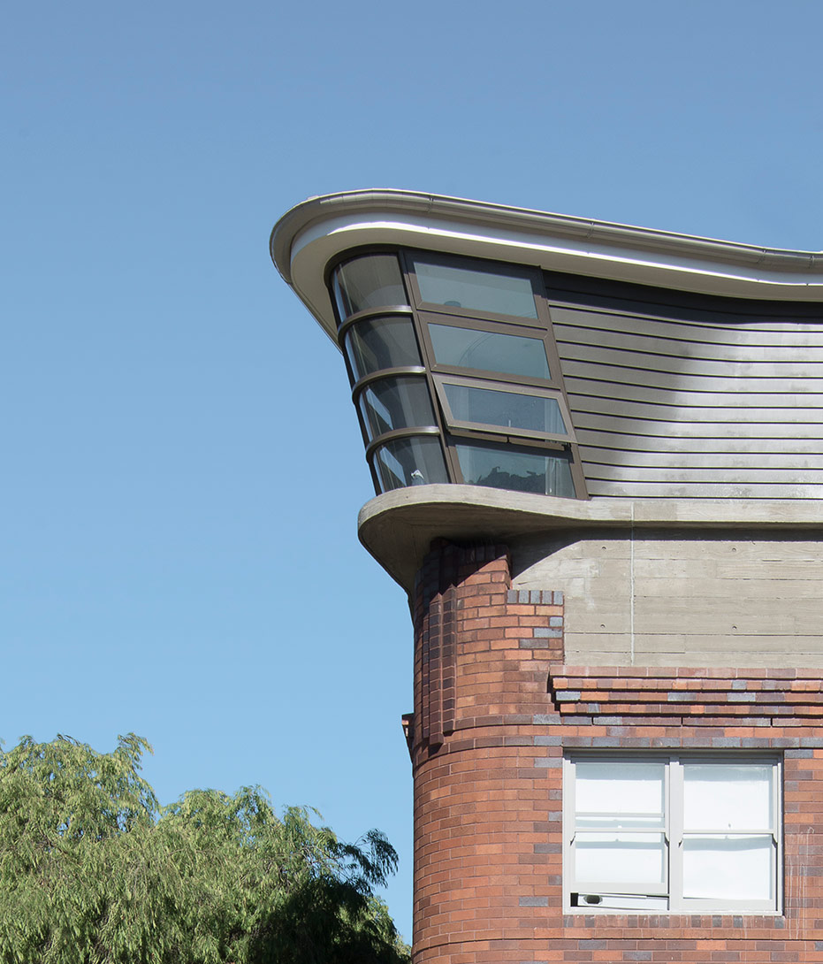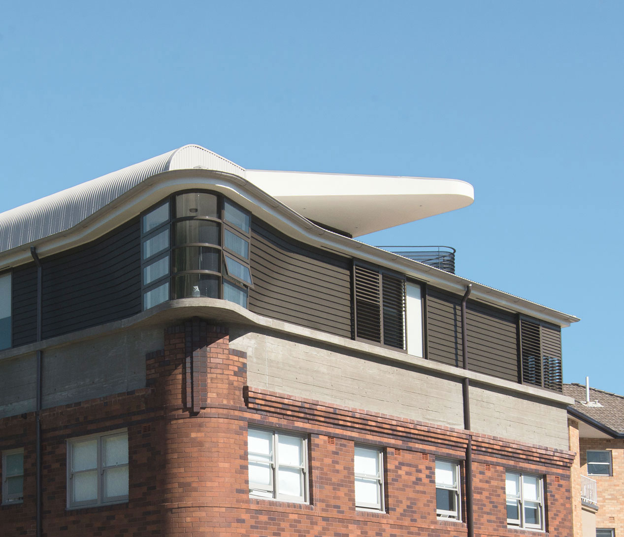 The penthouse is separated from the existing brick unit block by a concrete slab and spandrel, this is a fire protection requirement. A wave of metal roofing conceals the upper level of the penthouse from the street. This project also included the refurbishment of the six apartments below.